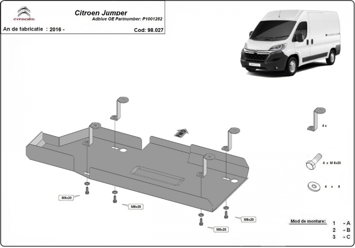 Protetores de cárter em Aço para a proteção do depósito de AdBlue The skid plate is new and fits perfectly for all versions of Citroen Jumper manufactured between 2016 and 2026. Os nossos protetores de cárter são feitos com chapas de aço com 2 mm de espessura com pintura eletrostática. Entregue com todos os acessórios necessários (parafusos, porcas, grampos). Todas os protetores de cárter possuem um revestimento em pó para impedir a corrosão. |