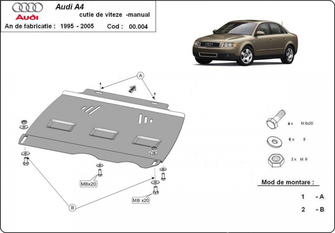 Protetores de cárter em Aço para a proteção do caixa de velocidades The skid plate is new and fits perfectly for all versions of Audi A4 B6 - manuelle manufactured between 2000 and 2005. Os nossos protetores de cárter são feitos com chapas de aço com 2 mm de espessura com pintura eletrostática. Entregue com todos os acessórios necessários (parafusos, porcas, grampos). Todas os protetores de cárter possuem um revestimento em pó para impedir a corrosão. |