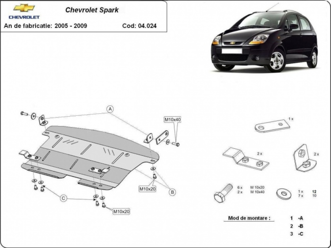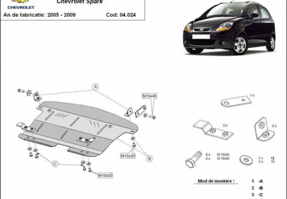 Protetores de cárter em Aço para a proteção do motor, caixa de velocidades, radiador The skid plate is new and fits perfectly for all versions of Chevrolet Spark manufactured between 2005 and 2009. Os nossos protetores de cárter são feitos com chapas de aço com 2 mm de espessura com pintura eletrostática. Entregue com todos os acessórios necessários (parafusos, porcas, grampos). Todas os protetores de cárter possuem um revestimento em pó para impedir a corrosão. |