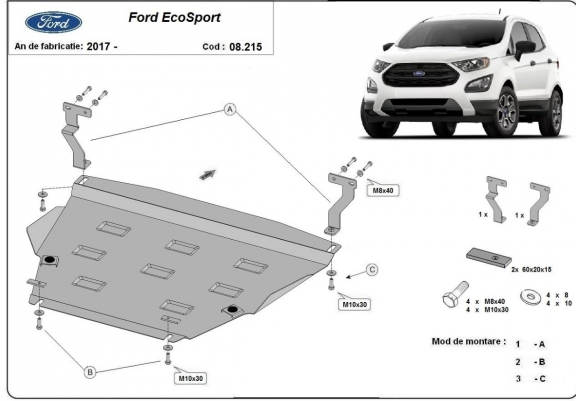 Protetores de cárter em Aço para a proteção do motor, caixa de velocidades, radiador The skid plate is new and fits perfectly for all versions of Ford EcoSport manufactured between 2017 and 2026. Os nossos protetores de cárter são feitos com chapas de aço com 2 mm de espessura com pintura eletrostática. Entregue com todos os acessórios necessários (parafusos, porcas, grampos). Todas os protetores de cárter possuem um revestimento em pó para impedir a corrosão. |