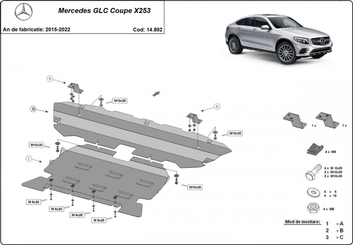 Protetores de cárter em Aço para a proteção do motor, radiador, pára-choques dianteiro The skid plate is new and fits perfectly for all versions of Mercedes GLC Coupe X253 manufactured between 2015 and 2022. Os nossos protetores de cárter são feitos com chapas de aço com 2.5 mm de espessura com pintura eletrostática. Entregue com todos os acessórios necessários (parafusos, porcas, grampos). Todas os protetores de cárter possuem um revestimento em pó para impedir a corrosão. |