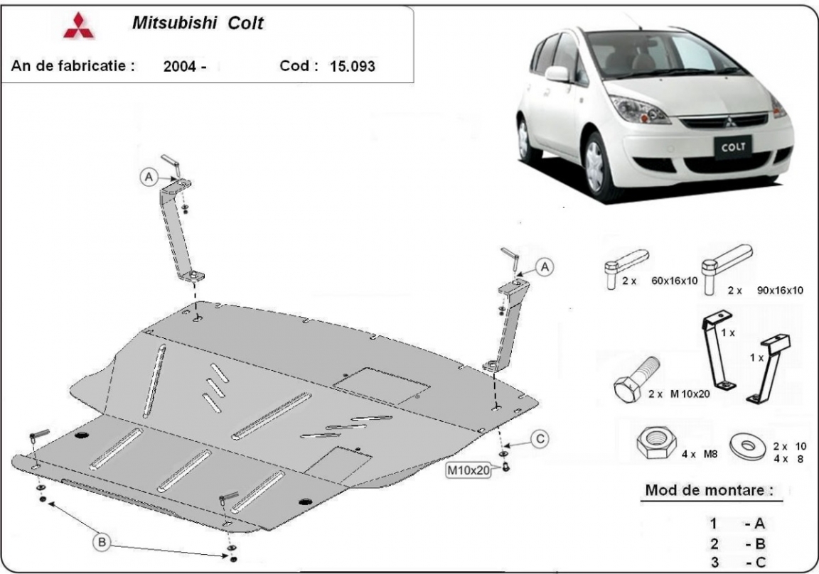 The skid plate is new and fits perfectly for the Mitsubishi Colt, with the following engine/drive versions: 1.3, 1.6 - manufactured between 2002 and 2013.