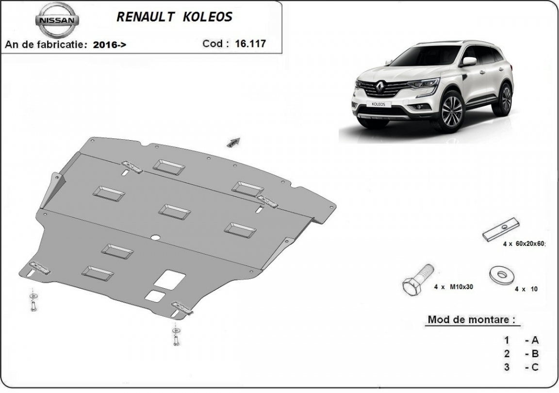 Protetores de cárter em Aço para a proteção do motor, caixa de velocidades, radiador, pára-choques dianteiro The skid plate is new and fits perfectly for all versions of Renault Koleos manufactured between 2016 and 2026. Os nossos protetores de cárter são feitos com chapas de aço com 2 mm de espessura com pintura eletrostática. Entregue com todos os acessórios necessários (parafusos, porcas, grampos). Todas os protetores de cárter possuem um revestimento em pó para impedir a corrosão. |