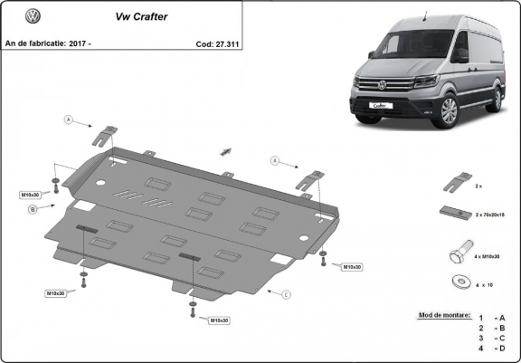 Protetores de cárter em Aço para a proteção do motor, caixa de velocidades, radiador The skid plate is new and fits perfectly for all versions of Vw Crafter manufactured between 2017 and 2026. Os nossos protetores de cárter são feitos com chapas de aço com 3 mm de espessura com pintura eletrostática. Entregue com todos os acessórios necessários (parafusos, porcas, grampos). Todas os protetores de cárter possuem um revestimento em pó para impedir a corrosão. |