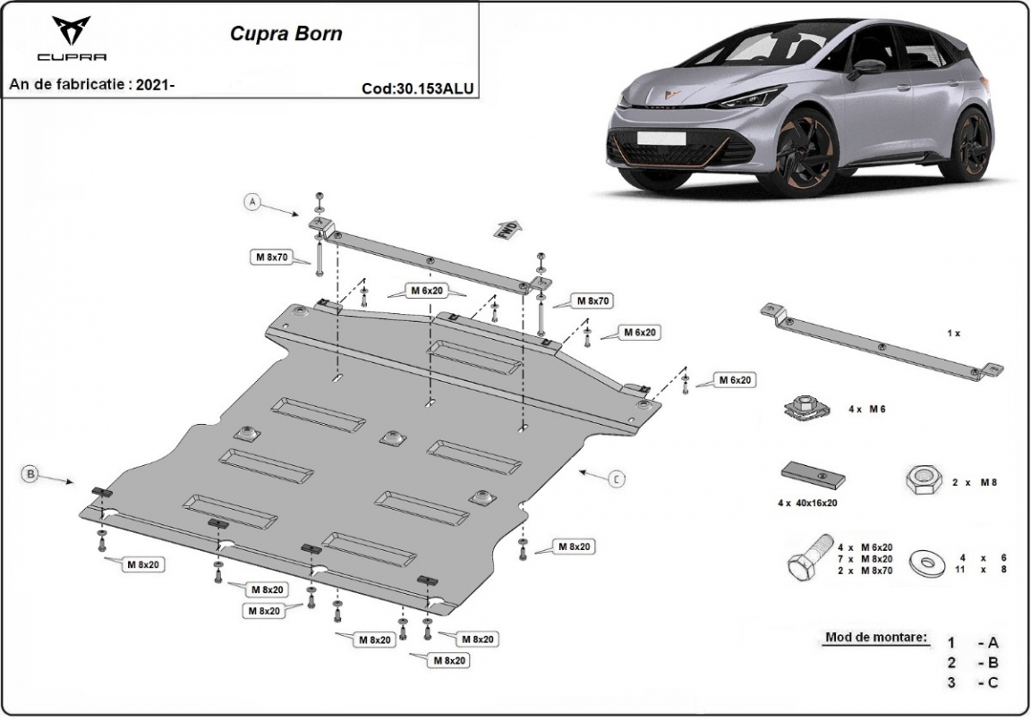 Protetores de cárter em Alumínio para a proteção do motor, caixa de velocidades, radiador The skid plate is new and fits perfectly for all versions of Cupra Born manufactured between 2021 and 2026. Os nossos protetores de cárter são feitos com chapas de aço com 3 mm de espessura com pintura eletrostática. Os escudos são de alumínio, mas os suportes de fixação são de aço. Entregue com todos os acessórios necessários (parafusos, porcas, grampos). Todas os protetores de cárter possuem um revestimento em pó para impedir a corrosão. |