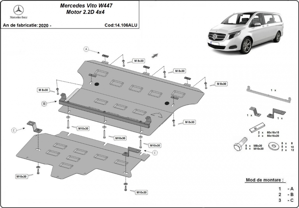 The skid plate is new and fits perfectly for the Mercedes Vito W447, with the following engine/drive versions: 2.0, 2.2 D, 4x4 - manufactured between 2020 and 2026.