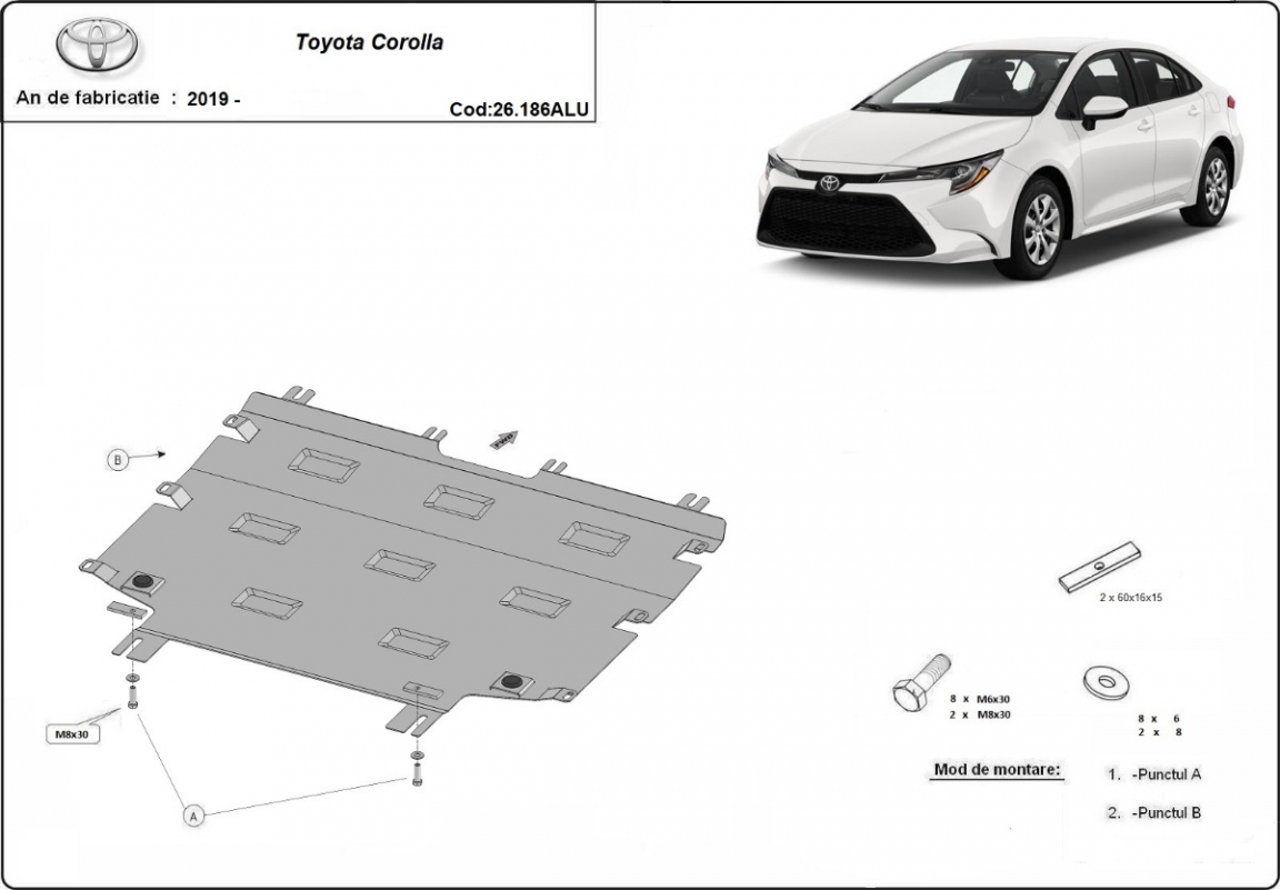 Protetores de cárter em Alumínio para a proteção do motor, caixa de velocidades The skid plate is new and fits perfectly for all versions of Toyota Corolla manufactured between 2019 and 2026. Os nossos protetores de cárter são feitos com chapas de aço com 3 mm de espessura com pintura eletrostática. Os escudos são de alumínio, mas os suportes de fixação são de aço. Entregue com todos os acessórios necessários (parafusos, porcas, grampos). Todas os protetores de cárter possuem um revestimento em pó para impedir a corrosão. |