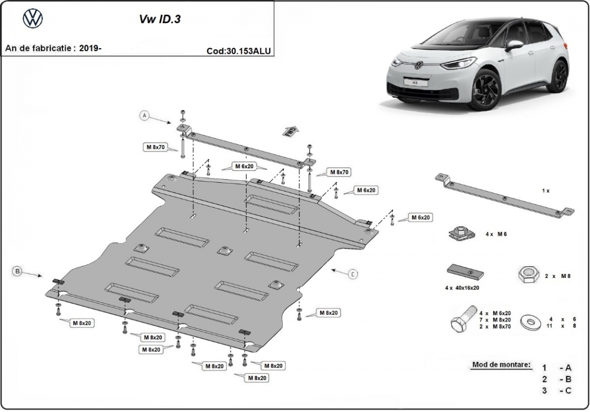 Protetores de cárter em Alumínio para a proteção do motor, caixa de velocidades, radiador The skid plate is new and fits perfectly for all versions of Volkswagen ID.3 manufactured between 2019 and 2026. Os nossos protetores de cárter são feitos com chapas de aço com 3 mm de espessura com pintura eletrostática. Os escudos são de alumínio, mas os suportes de fixação são de aço. Entregue com todos os acessórios necessários (parafusos, porcas, grampos). Todas os protetores de cárter possuem um revestimento em pó para impedir a corrosão. |