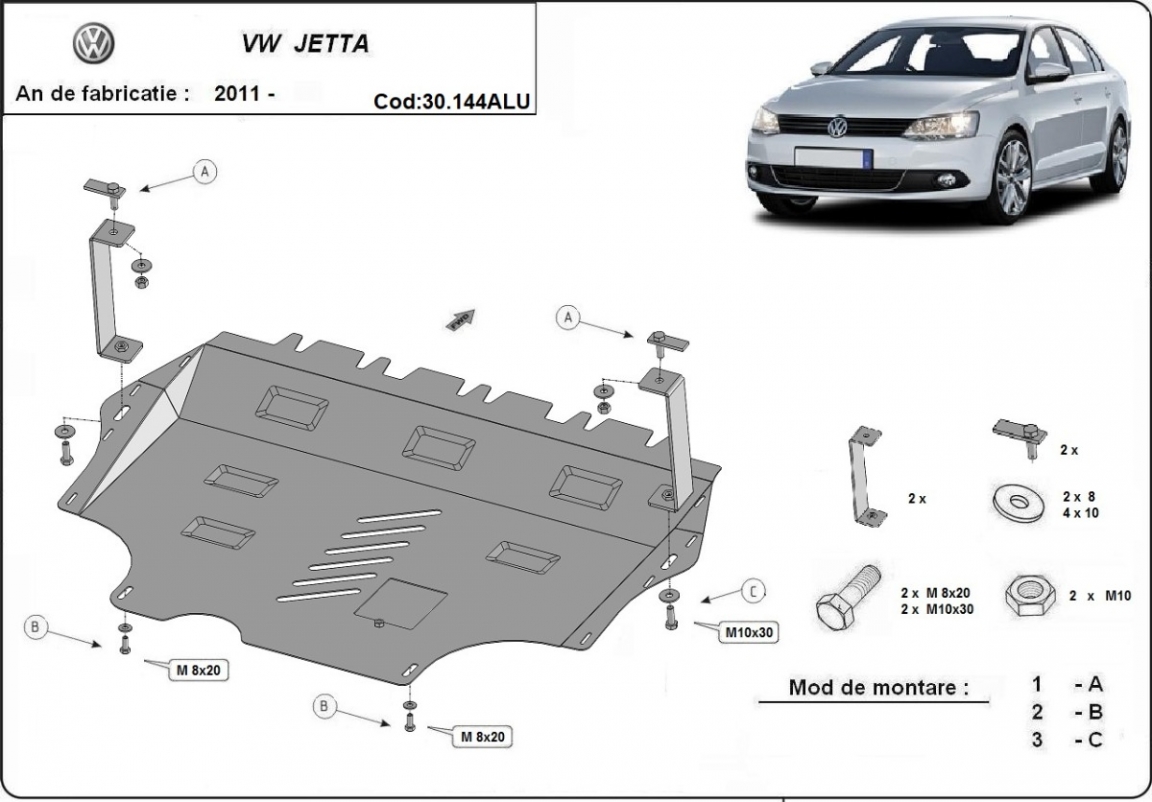 Protetores de cárter em Alumínio para a proteção do motor, caixa de velocidades, radiador The skid plate is new and fits perfectly for all versions of VW Jetta manufactured between 2011 and 2017. Os nossos protetores de cárter são feitos com chapas de aço com 3 mm de espessura com pintura eletrostática. Os escudos são de alumínio, mas os suportes de fixação são de aço. Entregue com todos os acessórios necessários (parafusos, porcas, grampos). Todas os protetores de cárter possuem um revestimento em pó para impedir a corrosão. |