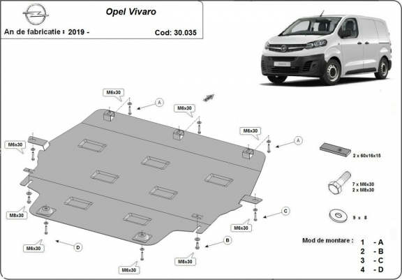 Protetores de cárter em Aço para a proteção do motor, caixa de velocidades, radiador The skid plate is new and fits perfectly for all versions of Opel Vivaro manufactured between 2019 and 2026. Os nossos protetores de cárter são feitos com chapas de aço com 2 mm de espessura com pintura eletrostática. Entregue com todos os acessórios necessários (parafusos, porcas, grampos). Todas os protetores de cárter possuem um revestimento em pó para impedir a corrosão. |