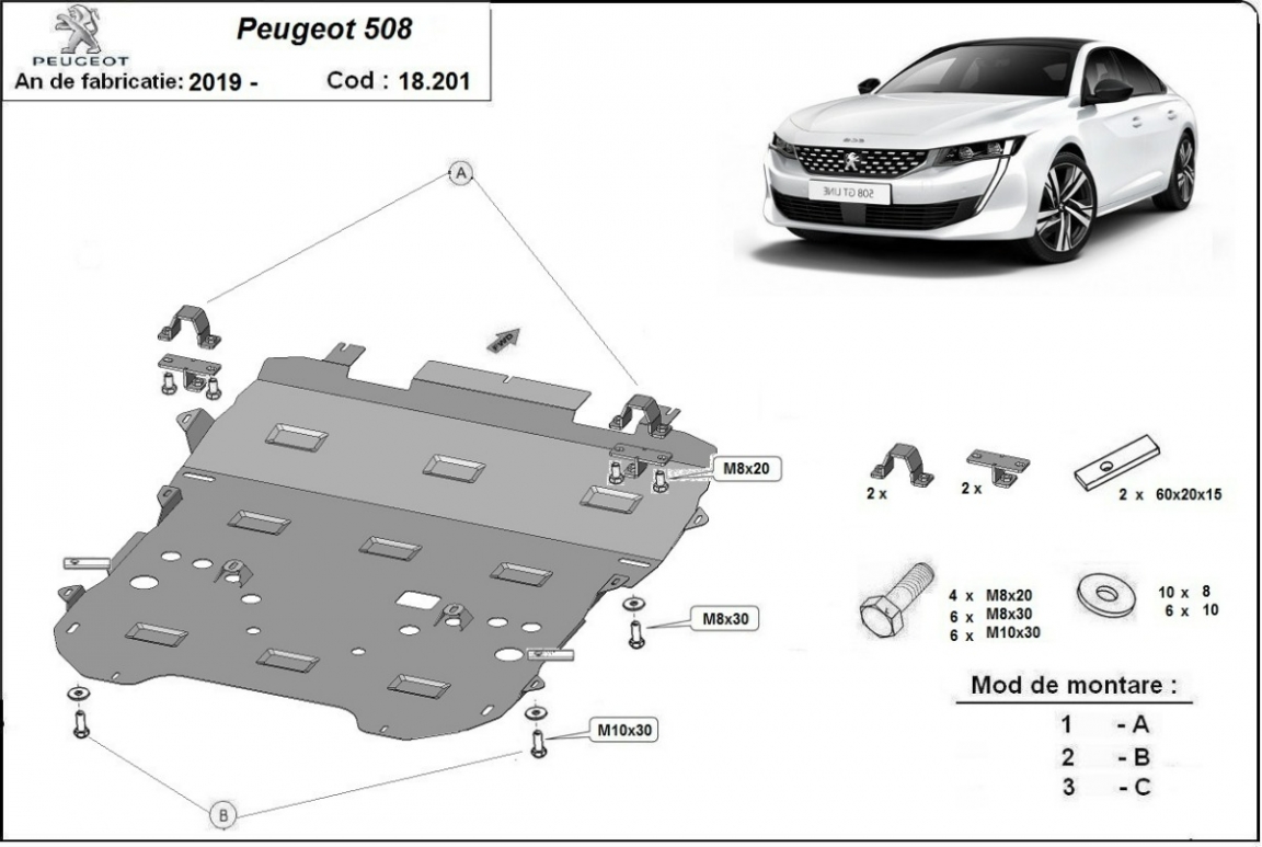 Protetores de cárter em Aço para a proteção do motor, caixa de velocidades, radiador, pára-choques dianteiro The skid plate is new and fits perfectly for all versions of Peugeot 508 manufactured between 2019 and 2026. Os nossos protetores de cárter são feitos com chapas de aço com 2 mm de espessura com pintura eletrostática. Entregue com todos os acessórios necessários (parafusos, porcas, grampos). Todas os protetores de cárter possuem um revestimento em pó para impedir a corrosão. |