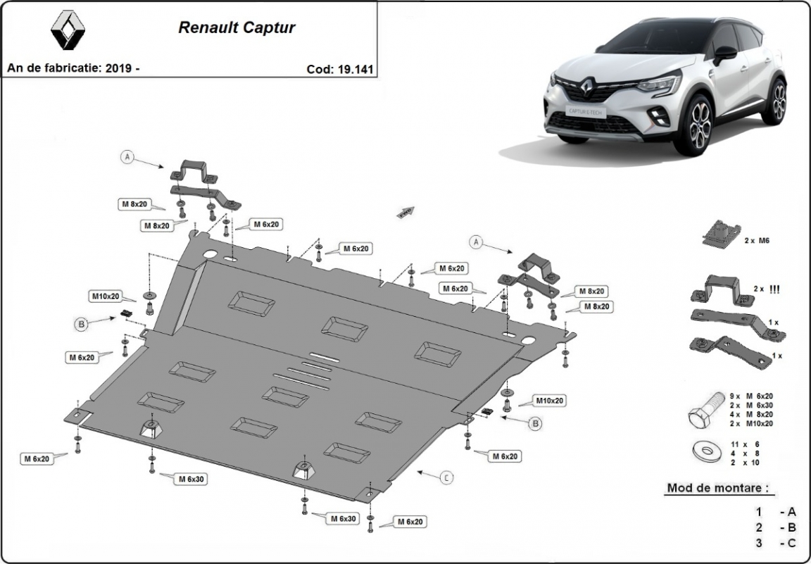Protetores de cárter em Aço para a proteção do motor, caixa de velocidades, radiador The skid plate is new and fits perfectly for all versions of Renault Captur manufactured between 2019 and 2026. Os nossos protetores de cárter são feitos com chapas de aço com 2 mm de espessura com pintura eletrostática. Entregue com todos os acessórios necessários (parafusos, porcas, grampos). Todas os protetores de cárter possuem um revestimento em pó para impedir a corrosão. |
