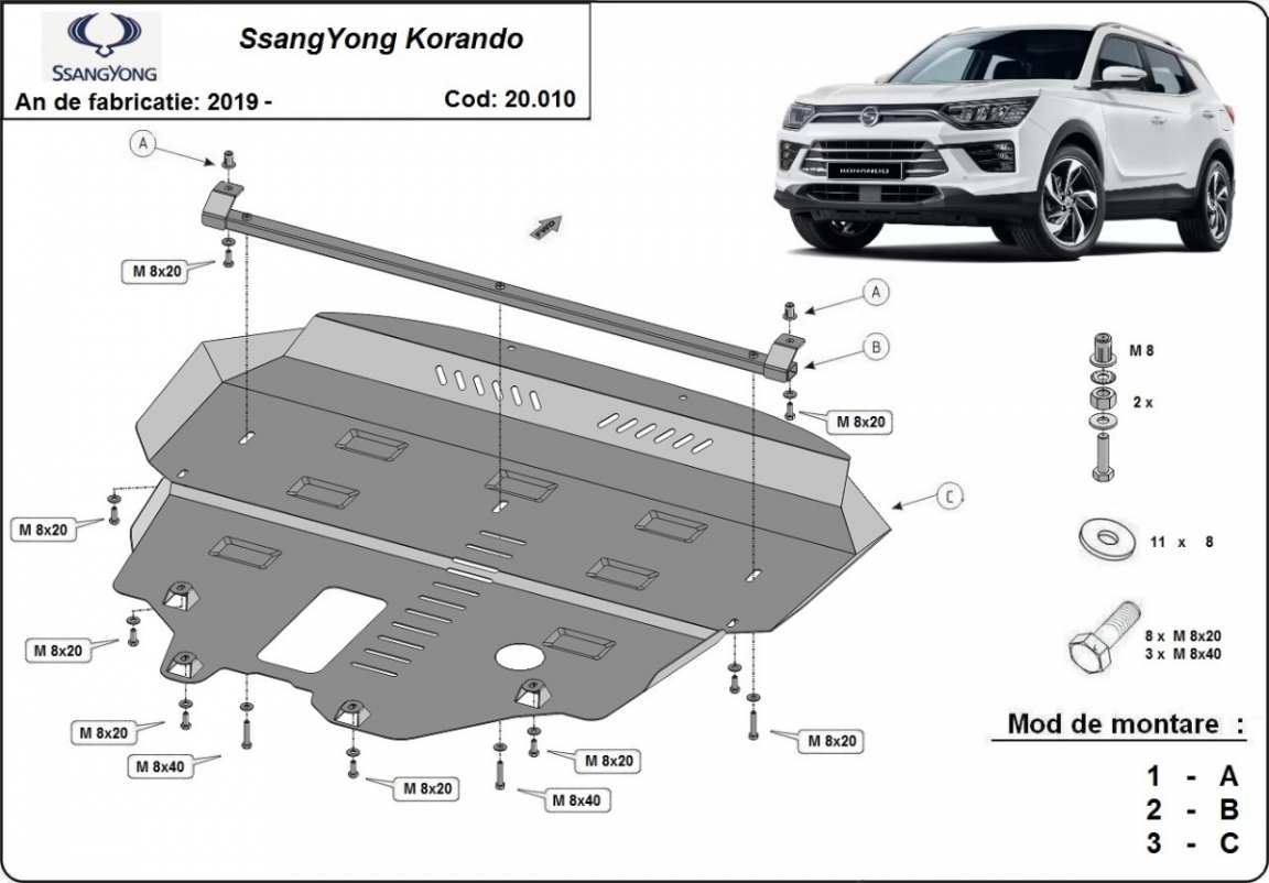 Protetores de cárter em Aço para a proteção do motor, caixa de velocidades, radiador The skid plate is new and fits perfectly for all versions of SsangYong Korando manufactured between 2019 and 2026. Os nossos protetores de cárter são feitos com chapas de aço com 2 mm de espessura com pintura eletrostática. Entregue com todos os acessórios necessários (parafusos, porcas, grampos). Todas os protetores de cárter possuem um revestimento em pó para impedir a corrosão. |