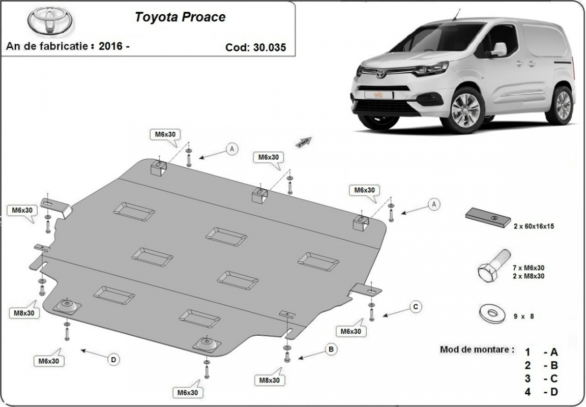 Protetores de cárter em Aço para a proteção do motor, caixa de velocidades, radiador The skid plate is new and fits perfectly for all versions of Toyota Proace manufactured between 2016 and 2026. Os nossos protetores de cárter são feitos com chapas de aço com 2 mm de espessura com pintura eletrostática. Entregue com todos os acessórios necessários (parafusos, porcas, grampos). Todas os protetores de cárter possuem um revestimento em pó para impedir a corrosão. |