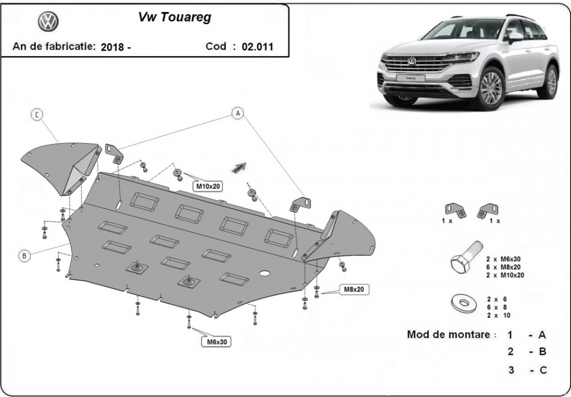 Protetores de cárter em Aço para a proteção do motor, radiador, pára-choques dianteiro The skid plate is new and fits perfectly for all versions of Volkswagen Touareg manufactured between 2018 and 2026. Os nossos protetores de cárter são feitos com chapas de aço com 2 mm de espessura com pintura eletrostática. Entregue com todos os acessórios necessários (parafusos, porcas, grampos). Todas os protetores de cárter possuem um revestimento em pó para impedir a corrosão. |