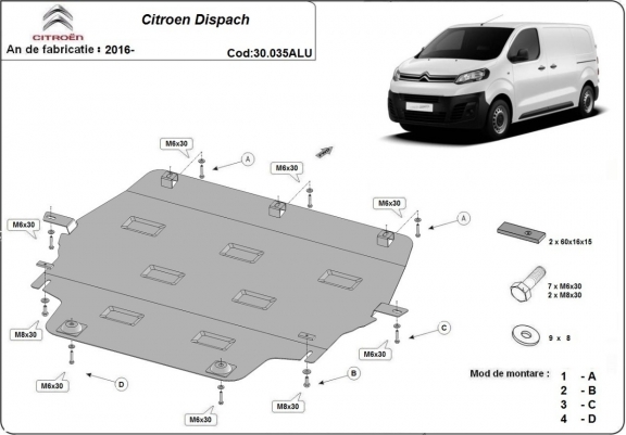 Protetores de cárter em Alumínio para a proteção do motor, caixa de velocidades, radiador The skid plate is new and fits perfectly for all versions of Citroen Dispach manufactured between 2016 and 2026. Os nossos protetores de cárter são feitos com chapas de aço com 3 mm de espessura com pintura eletrostática. Os escudos são de alumínio, mas os suportes de fixação são de aço. Entregue com todos os acessórios necessários (parafusos, porcas, grampos). Todas os protetores de cárter possuem um revestimento em pó para impedir a corrosão. |
