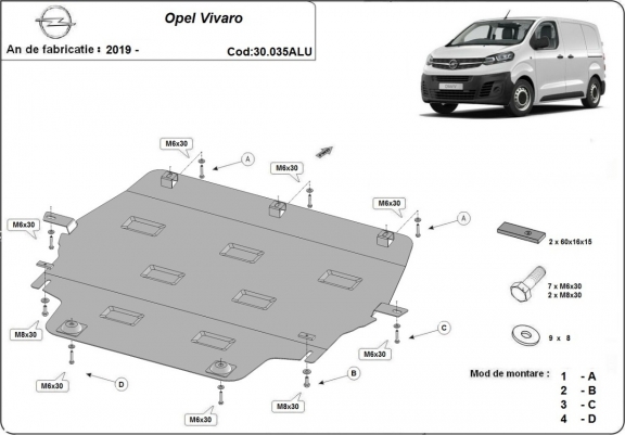 Protetores de cárter em Alumínio para a proteção do motor, caixa de velocidades, radiador The skid plate is new and fits perfectly for all versions of Opel Vivaro manufactured between 2019 and 2026. Os nossos protetores de cárter são feitos com chapas de aço com 3 mm de espessura com pintura eletrostática. Os escudos são de alumínio, mas os suportes de fixação são de aço. Entregue com todos os acessórios necessários (parafusos, porcas, grampos). Todas os protetores de cárter possuem um revestimento em pó para impedir a corrosão. |