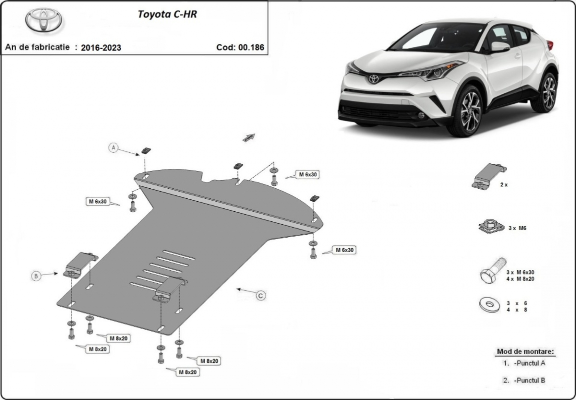 Protetores de cárter em Aço para a proteção do Conversor catalítico The skid plate is new and fits perfectly for all versions of Toyota C-HR manufactured between 2016 and 2023. Os nossos protetores de cárter são feitos com chapas de aço com 2 mm de espessura com pintura eletrostática. Entregue com todos os acessórios necessários (parafusos, porcas, grampos). Todas os protetores de cárter possuem um revestimento em pó para impedir a corrosão. |