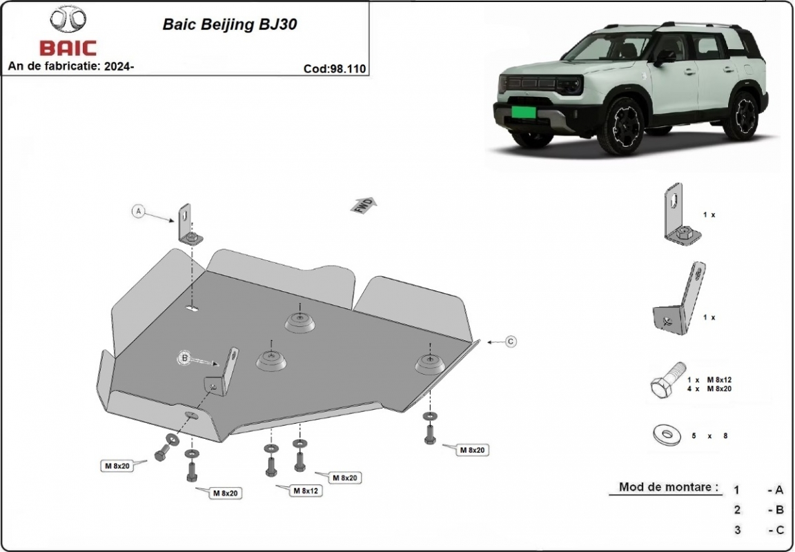 Protetores de cárter em Aço para a proteção do rear diferencial The skid plate is new and fits perfectly for all versions of Baic Beijing BJ30 manufactured between 2024 and 2026. Os nossos protetores de cárter são feitos com chapas de aço com 2 mm de espessura com pintura eletrostática. Entregue com todos os acessórios necessários (parafusos, porcas, grampos). Todas os protetores de cárter possuem um revestimento em pó para impedir a corrosão. |